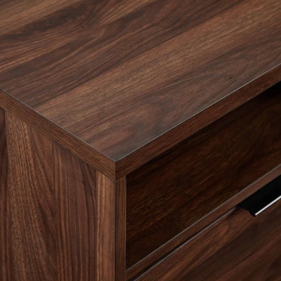 Welcome a 60” Modern Storage Fireplace TV Console by Saracina Home into your living room, bedroom, or home office. This warm entertainment center hosts a versatile array of open and closed storage. Two open cubbyholes are available for displaying your favorite electronic goods. The left side has two cabinet doors while the right side hosts two closed drawers; both closed storage options have grooved, cut-out handles for a streamlined look. And with soft-close hinges and telescoping drawer glides, never stress about wear and tear . An electric fireplace insert is the highlight of this TV storage stand as you can turn on the faux flames, only turn on the heat, or switch on both! This fireplace media center can accommodate TVs up to 65”.